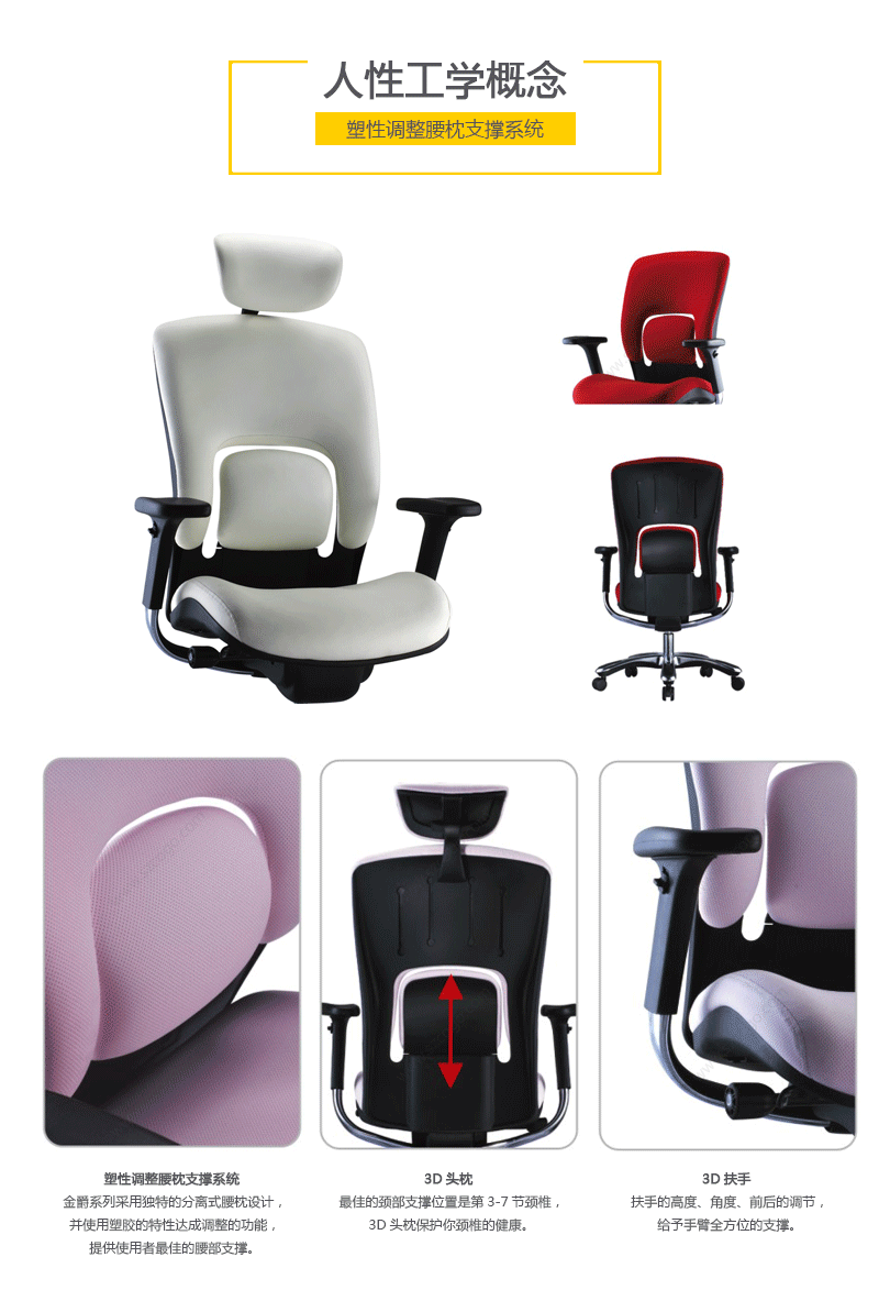 "金爵系列采用独特的分离式腰枕设计,并使用塑胶的特性达成调整的功能,提供使用者最佳的腰部支撑。"
