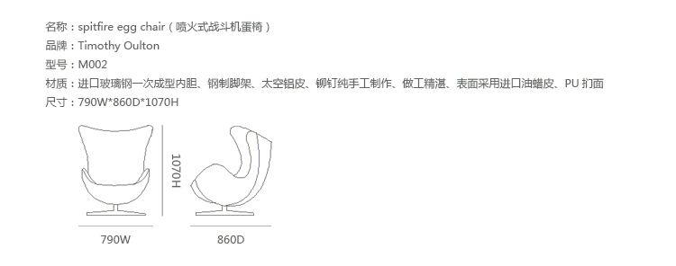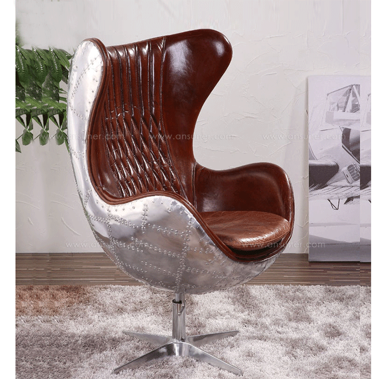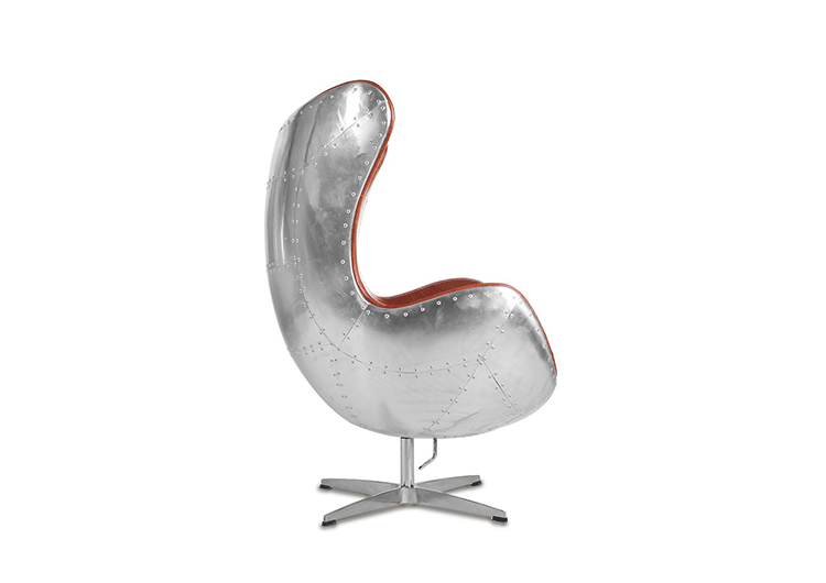 蛋椅(Egg Chair)是为了哥本哈根皇家酒店的大厅以及接待区而被设计出来的,因为当时的机器还不成熟,所有东西都需要经过手工处理,当时Arne Jacobsen在家的车库中设计出蛋椅。蛋椅(Egg Chair)采用玻璃钢内坯,外层是羊毛绒布或者意大利真皮,座垫和靠背大小符合人体结构,内有定型海绵,增加弹性,而且耐坐不变形。整个椅子的布或皮下面都有垫弹性海绵,不仅外观圆滑且更富有弹性,让坐感更加舒适。四星亮光铝脚,鸡蛋椅可以360度旋转(带倾仰功能)。铝合金脚和不锈钢脚,都要达到镜面效果,光亮照人,加上精心设计的椅脑与扶手,两边对称相应,配上脚踏,更具人性化。