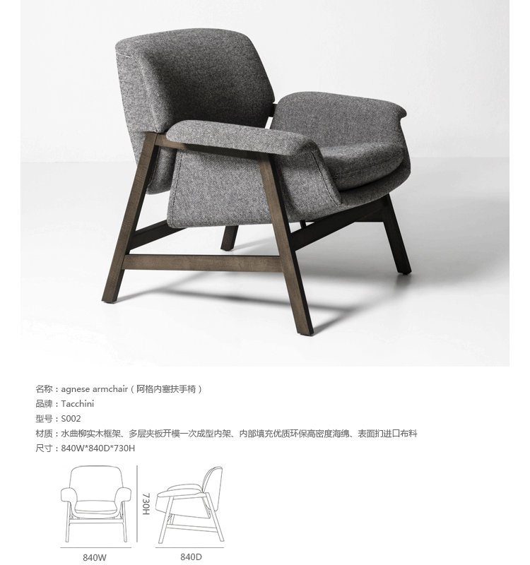 Tacchini关于家具的持久和激情研究总是会促使公司去发现新的形状、 材料和创作个性,同时还要重新发现历史的设计大师。在继回顾Achille Castiglioni和Franco Albini之后,这次Tacchini的焦点是Gianfranco Frattini--上世纪50年代初到世纪末最重要的意大利设计师之一。Tacchini这次重新演绎Gianfranco Frattini的经典作品Agnese Armchair(阿格内塞扶手椅),让这个著名的原创作品再次回归消费者。秉持对原设计的极端忠诚,采用水曲柳实木框架、多层夹板开模一次成型内架、内部填充优质环保高密度海绵、表面扪进口布,通过精湛的工艺进行制作。其目的是支持一个伟大的设计师风格的复兴,甚至是整个室内设计家装行业。